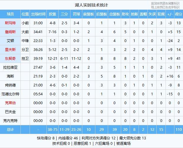湖人:东契奇41分8板8助2断、詹姆斯15分6板5助、里夫斯14分3板2助2断、斯玛特13分1板3助、拉拉维亚11分5板1助、肯纳德8分3板、海斯6分8板1助、艾顿2分4板