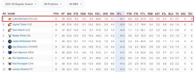 肯纳德打出了投篮180俱乐部的表现——投篮命中率50%以上,三分命中率40%以上,罚球命中率90%以上。在本赛季的三分命中率榜上,肯纳德高居第一。骑士队的泰森以45.9%排名第二,梅里尔45.8%排名第三,波蒂斯以45.3%排名第四,杰登·麦克丹尼尔斯以44.9%排名第五。
